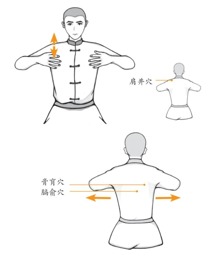 动作要领:要将意识放于两腋下,犹如夹了个馒头。