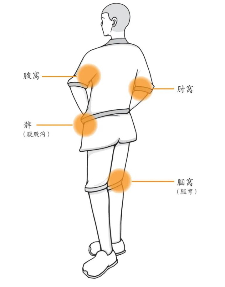 有八个非常重要的部位,两肘窝、两腋窝、两髀(腹股沟)、两腘窝(腿弯),被合称为“八虚”。关于八虚的养护,早在《黄帝内经·灵枢经·邪客》中就有记载——