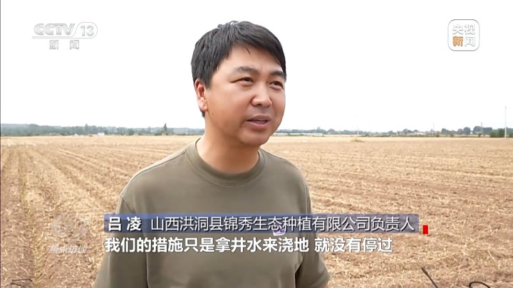 山西洪洞县锦秀生态种植有限公司负责人吕凌:墒情差到向土里挖四五十厘米都不见墒。很着急,老天不下雨,我们不停地拿井水来浇地,也缓解不了旱情。