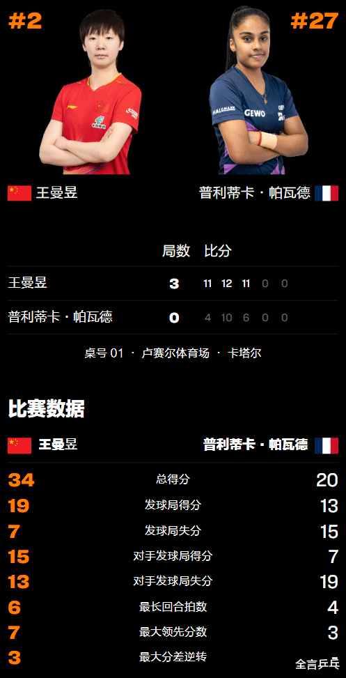 帕瓦德目前排名世界第27位,实力不错但对国乒主力的威胁一般,此前2次与王曼昱交手全部都是0-3惨败被横扫,如今再次相遇赢球的难度非常大。