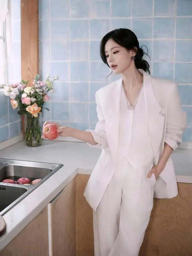 近日,一组李一桐的居家写真释出,图片中的她在厨房穿纯白西装,尽显松弛。